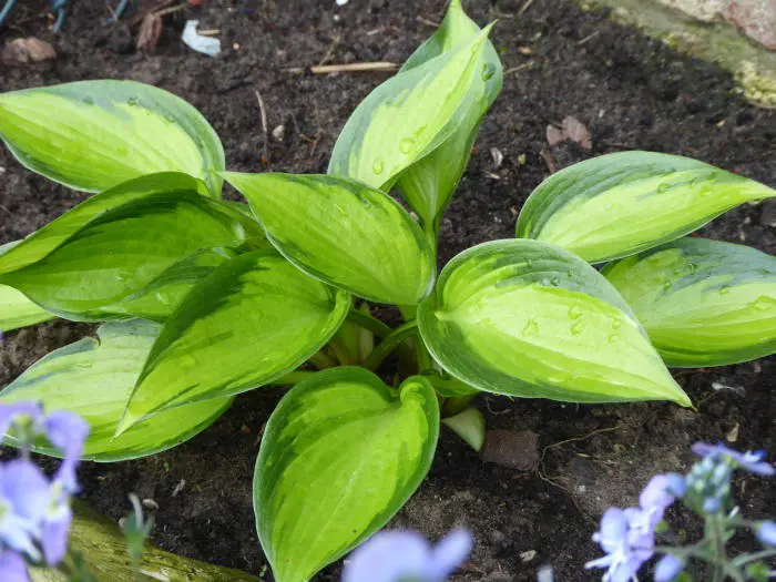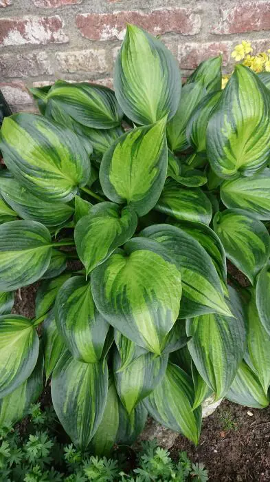 Hosta 'Justine' bildet kräftige, grünlich-gelbe Blätter mit einem dunkelgrünen Rand.Er verträgt Schatten, aber die Blattfarbe ist in der Sonne viel schöner.