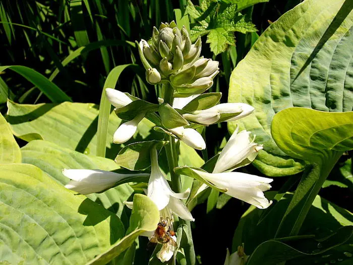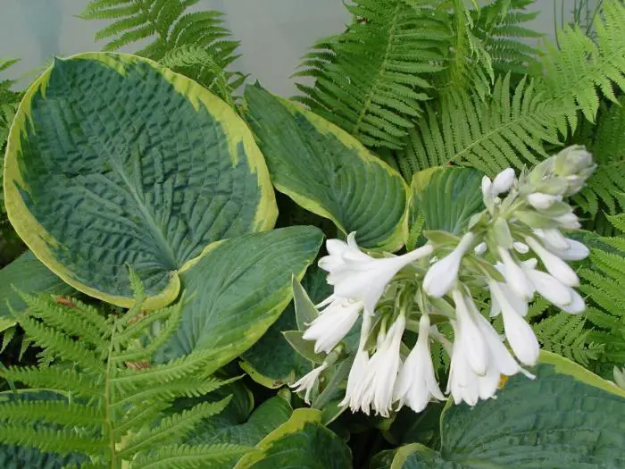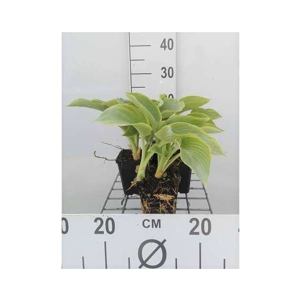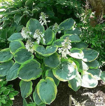 Sie gilt als eine der schönsten Hostas mit ihren blaugrünen Blättern und gelben Rändern, die mit (fast) weißen, trompetenartigen Blüten blühen.