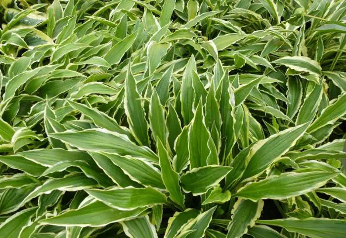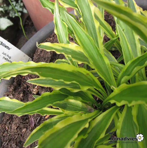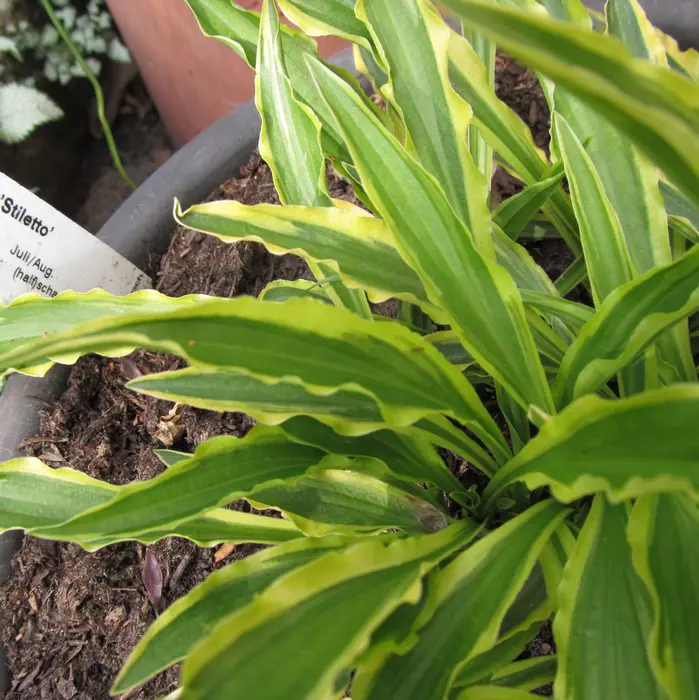 Hosta 'Stiletto' ist eine Miniatur mit langen, schmalen grünen Blättern, gelb bis cremeweiß umrandet.