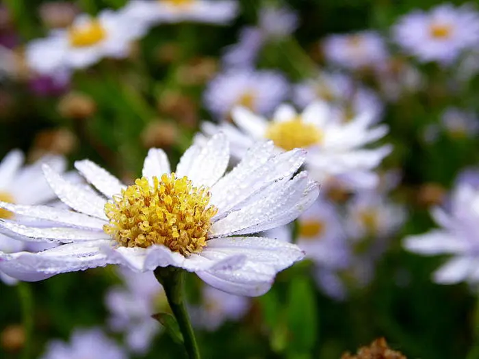 Die vielen kleinen weißen Blüten mit einem dezenten purpurfarbenen Schimmer und einem gelben Herzen blühen den ganzen Sommer über.