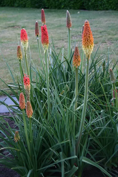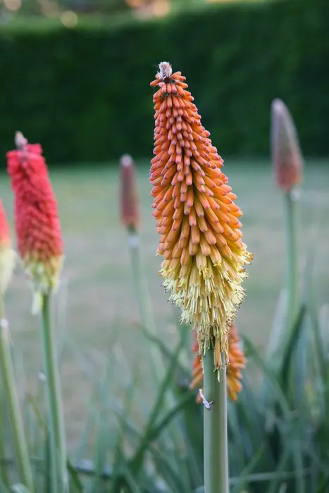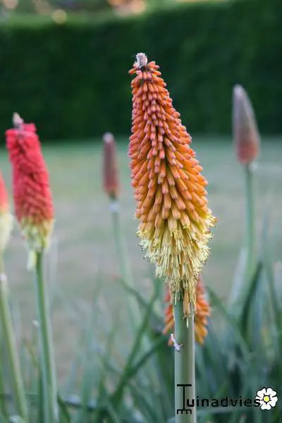 Blühen Sie an langen, nackten Blütenstängeln mit spitzenförmigen Blütenclustern in verschiedenen Farbtönen von Gelb und/oder Orange bis Rot.