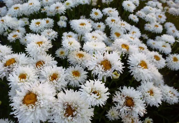 Leucanthemum x superbum 'Engelina' ist eine blühende Staude mit welligen weißen Blütenblättern, sehr fein und lockig wie ein loser Pompon um ein gelbes Herz.
