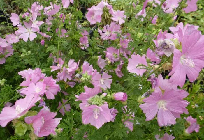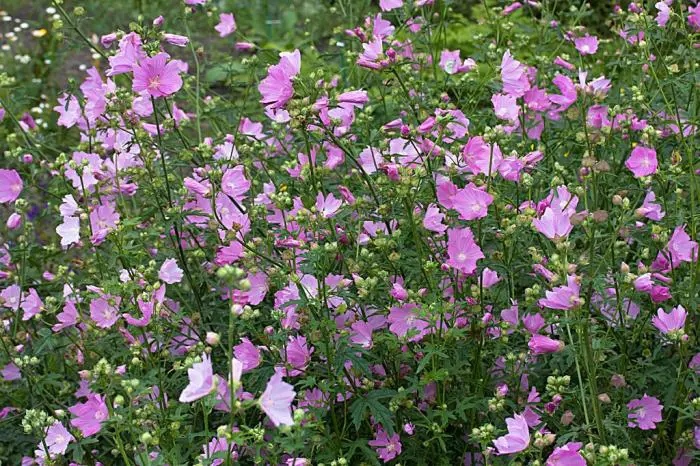 Malva alcea 'Fastigiata' ist eine aufrechte Pflanze mit tief eingeritzten Blättern.Blüht an hohen, geraden Stängeln mit schuppenförmigen, tiefpinken Blüten.