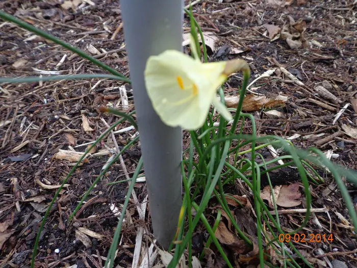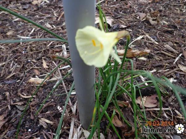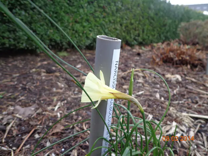 Narcissus bulbocodium blüht mit trichterförmigen gelben Blüten, deren Blätter grasartig sind.