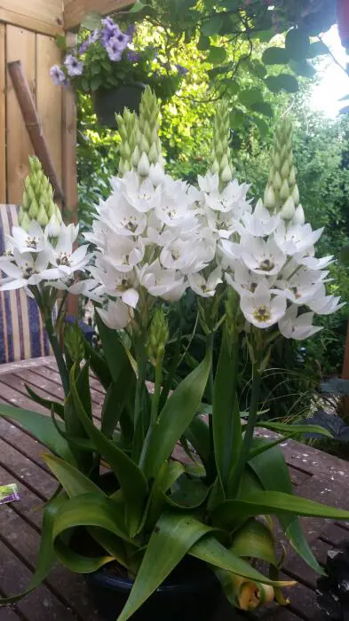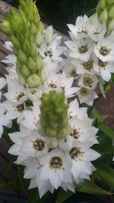 Ornithogalum thyrsoides 'Schneeflocke' bildet am oberen Rand des Stängels eine pyramidenförmige weiße Blütengruppe. 'Snowflake' ist eine kompakte Variante.