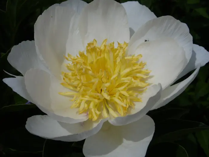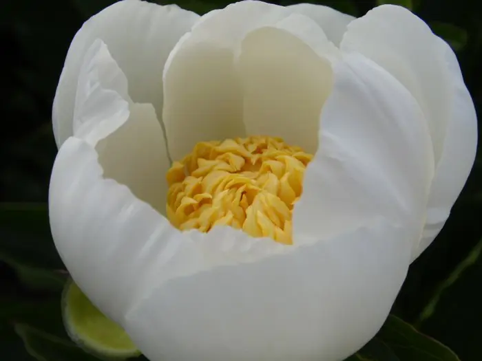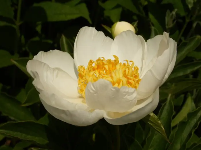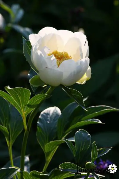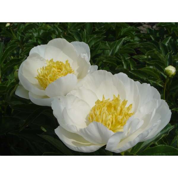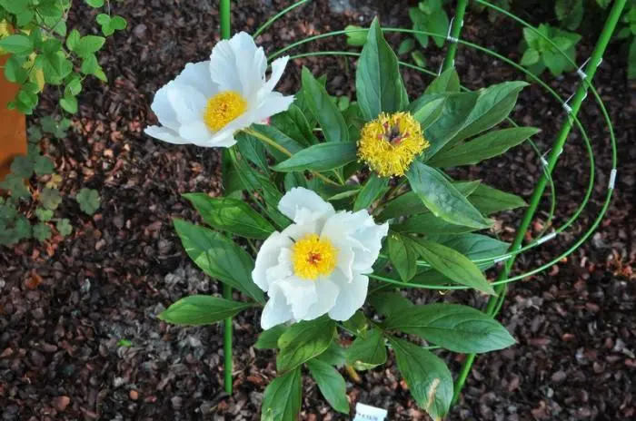 Die Blüten dieser krautigen Pfingstrose sind einzeln mit japanischer Blütenform, bestehend aus breiten, reinweißen Blütenblättern und einem markanten Kern gelber, blattförmiger Staubblätter.