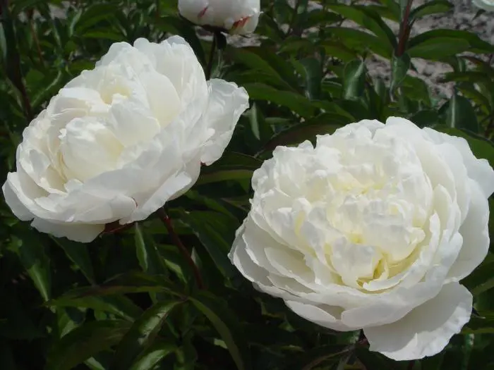 Paeonia lactiflora 'Shirley Temple' blüht mit sanft rosafarbenen, weißen Doppelblüten.