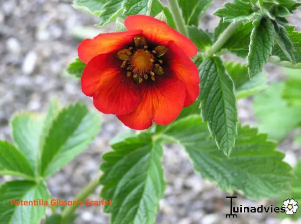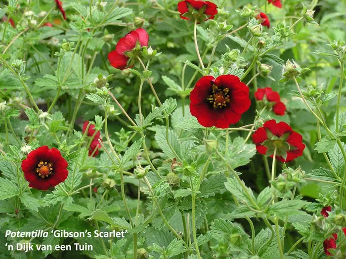 Potentilla 'Gibson's Scarlet' ist eine staudige, kriechende Pflanze aus Nepal und bietet den ganzen Sommer über intensive scharlachrote Blüten.