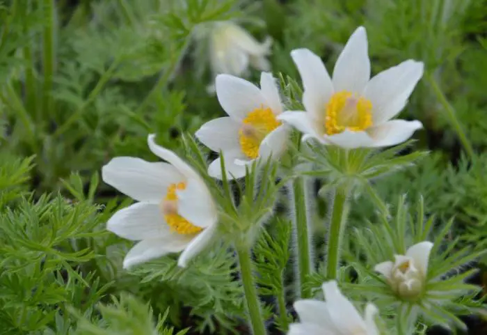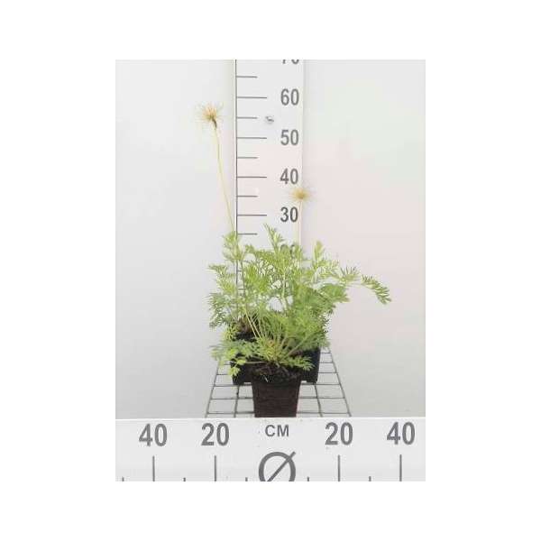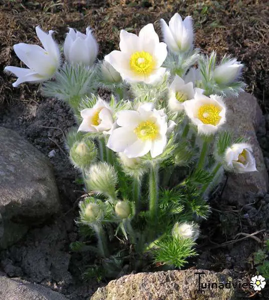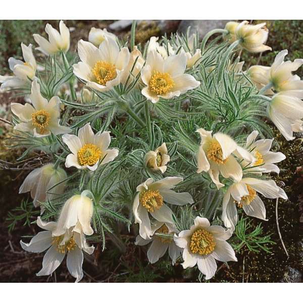 Pulsatilla vulgaris 'Alba' blüht im frühen Frühling, ist 15 cm hoch und wächst nach der Blüte bis zu 40 cm mit runden, haarigen, federförmigen Samenköpfen.