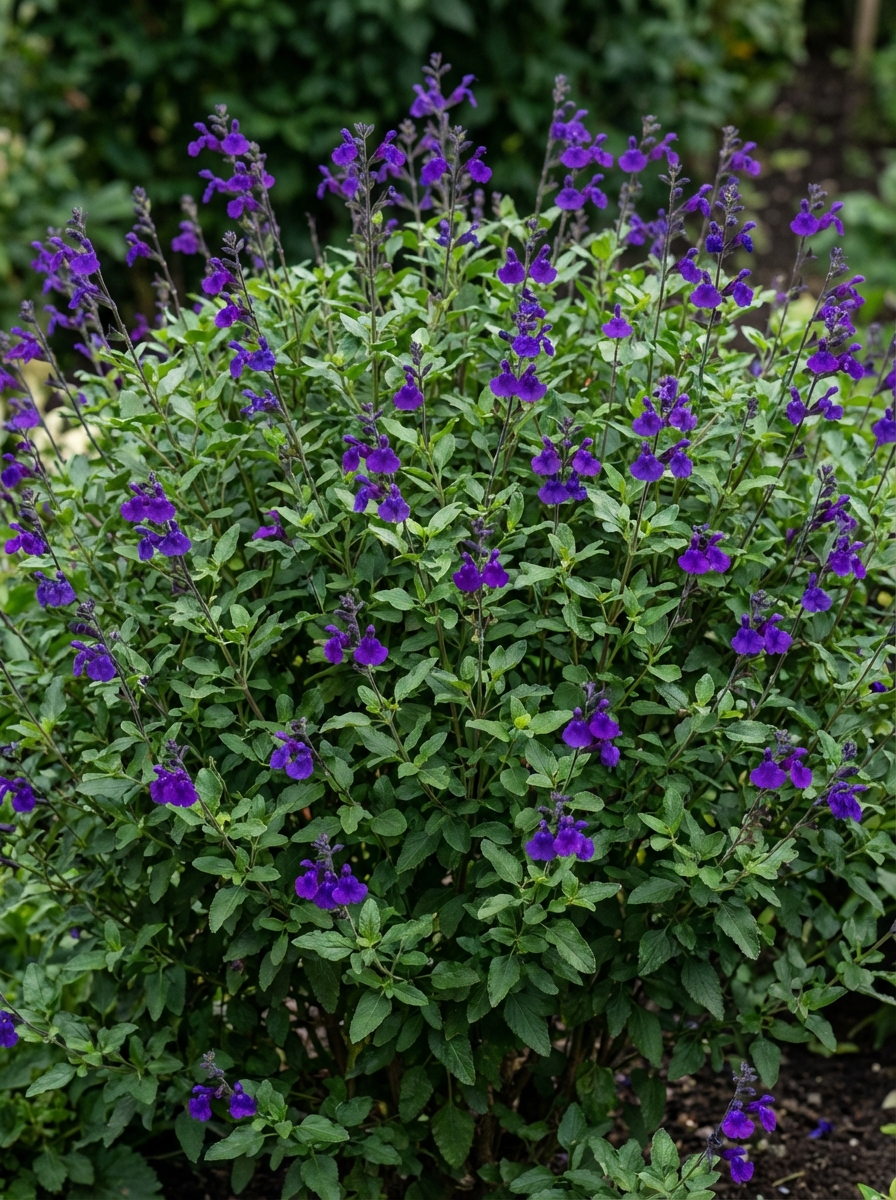 Salvia x jamensis 'Violette de Loire' bildet eine buschige, gut verzweigte Staude mit aromatischen, dunkelgrünen Blättern.