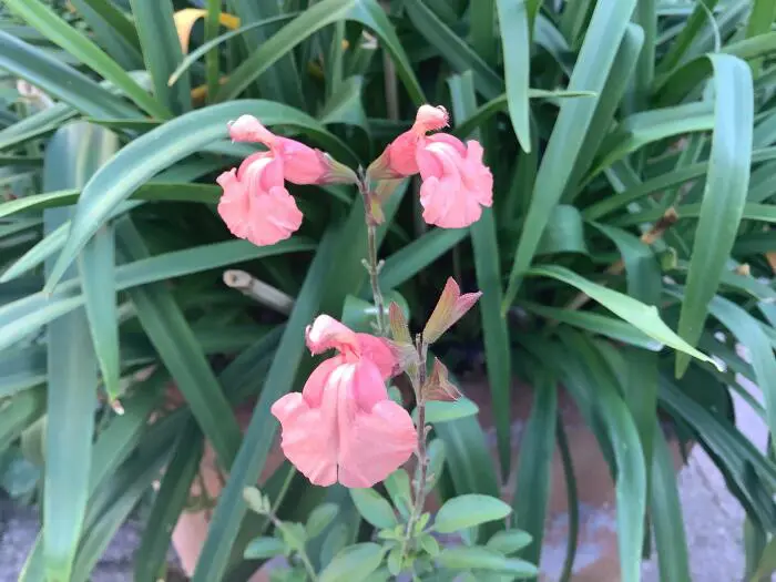 Salvia microphylla 'Papajan' blüht mit trompetenförmigen, lachsrosa Blüten.