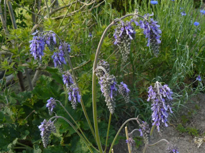 Die violettblauen Stacheln hängen anmutig von hohen, blattlosen Stängeln herab.