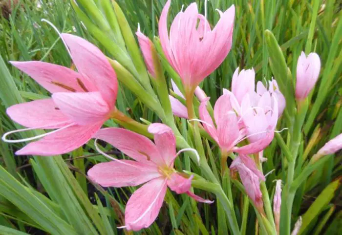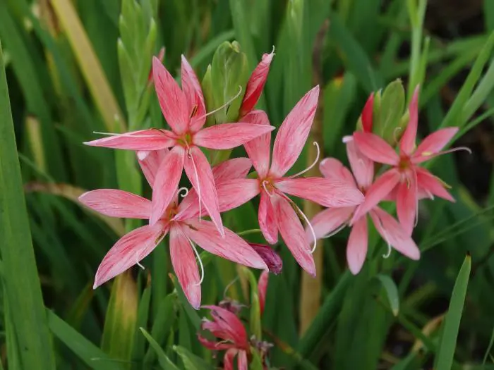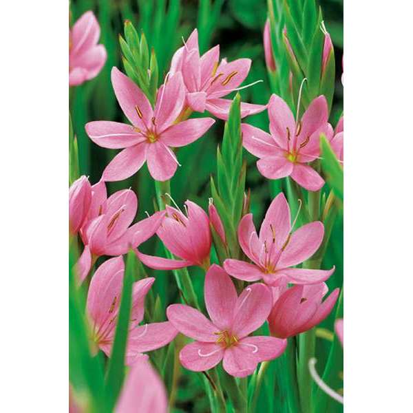 Schizostylis coccinea 'Mrs Hegarty' ist eine rhizomatische mehrjährige Pflanze mit schmalen, schwertförmigen, hellgrünen Blättern und kräftigen Stängeln mit lockeren Blüten blassrosa Blüten.