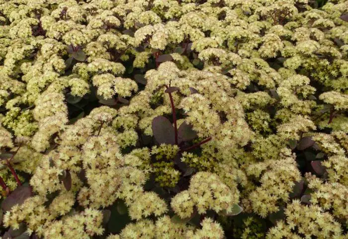 Sedum 'Eline' hat fleischige, schokoladenfarbene, bronzefarbene Blätter mit violetten Adern und rosa Blütenknospen, die cremig-gelb blühen.