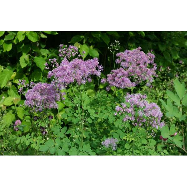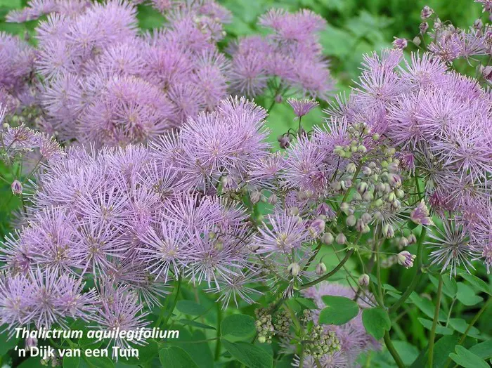Thalictrum aquilegifolium ist eine mehrjährige Pflanze, die hohe Stängel mit großen Blütenständen bildet, bestehend aus kleinen Blüten mit langen und zahlreichen fliederfarbenen Staubblättern, was ihnen einen Charakter von verworrenen und fluffigen Pompons verleiht.