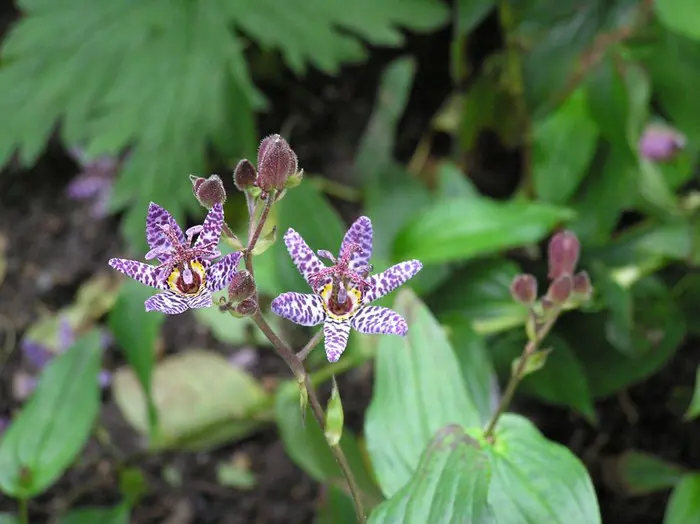 Die Blüten von Tricyrtis formosana 'Dark Beauty' ähneln kleinen violetten Lilien, die stark mit Lila und Gelb-Orange im Hals auf kräftigen Stängeln gesprenkelt sind.