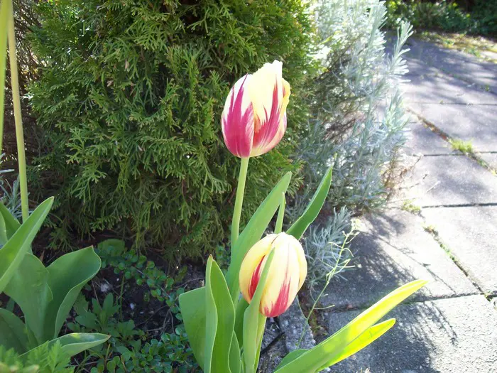 Eine frühe Tulpe, rot/gelb mit grau-grünen Blättern.