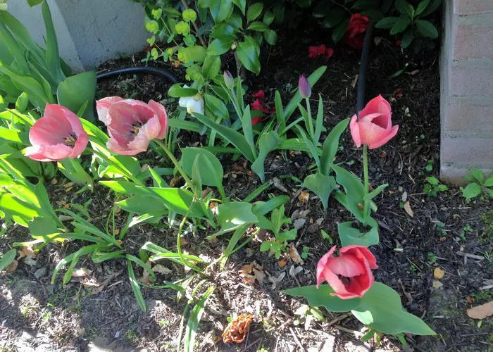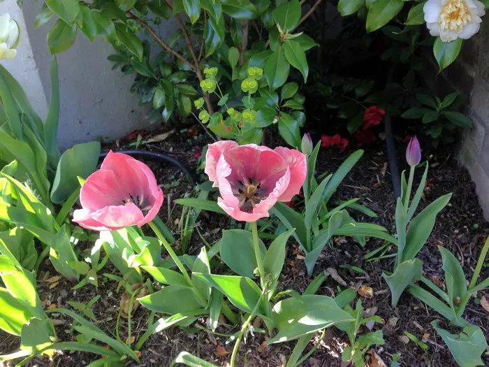 Ein Darwin-Hybrid mit lachsrosa Blüten und weißen Herzen an hohen Stängeln.