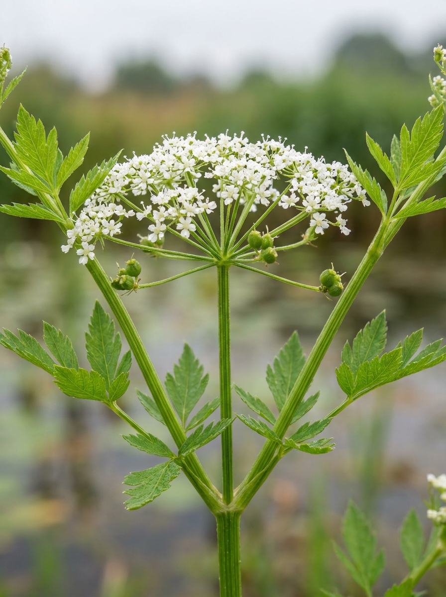 Berula erecta ist hier eine einheimische Uferpflanze, die in Gräben, Bächen und Sümpfen wächst.Hat blau-grüne gefiederte Blätter und blüht mit weißen Umbellifern.Bildet unterirdische Vorgebirge.
