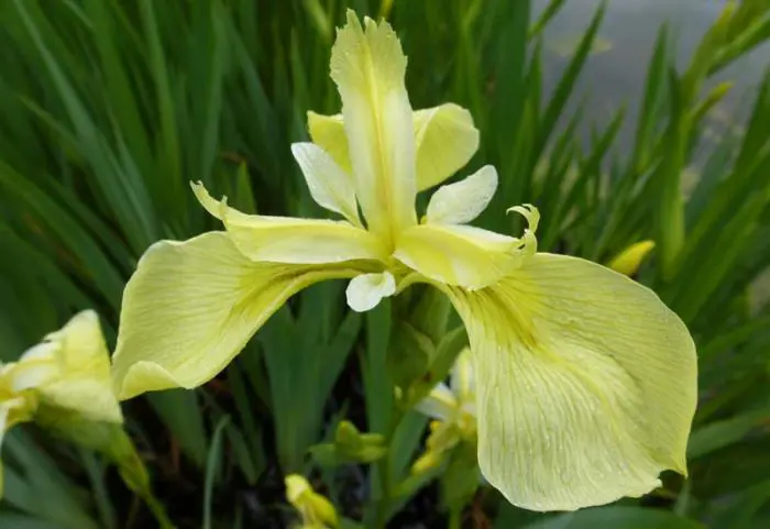 Iris pseudacorus 'Bastardii' ist eine landesweite, rhizomatische halbaquatische Staude mit blassgelben Blüten.