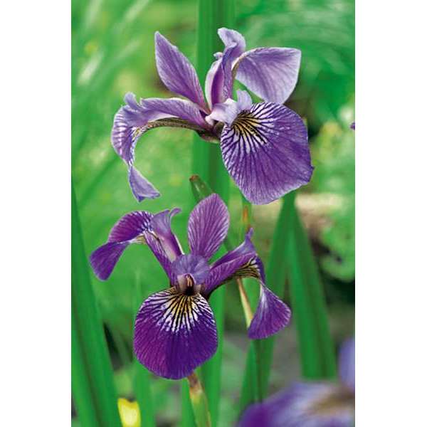 Iris versicolor hat lange, schwertförmige Blätter und blüht mit violett-violetten Blüten mit einer weißen, gelben Zeichnung in der Mitte.