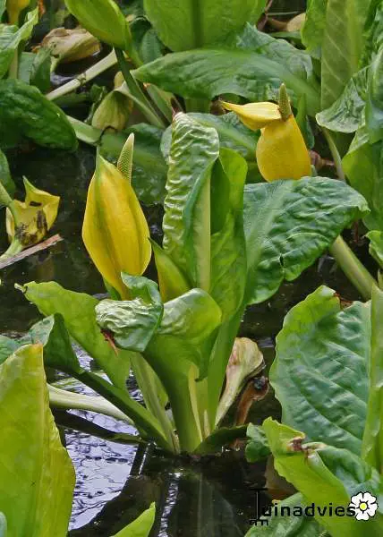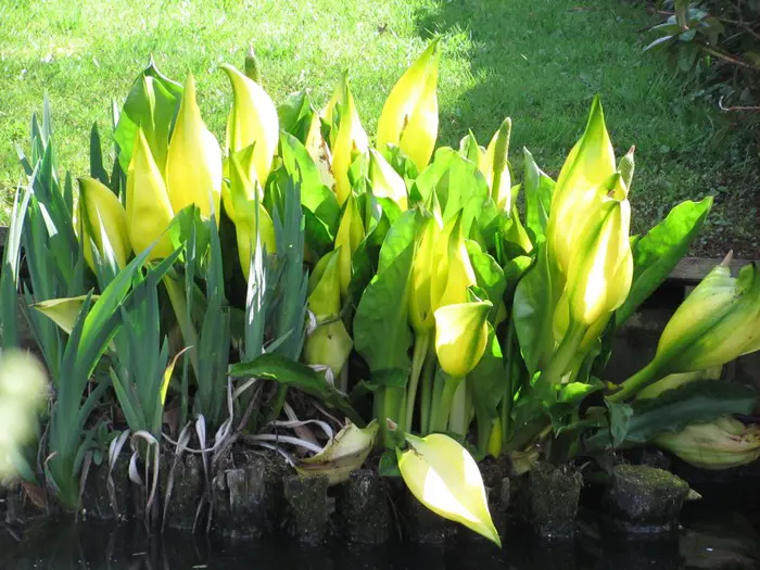 Lysichiton americanus sind Ufer- oder Sumpfpflanzen und blühen vor dem Erscheinen der gelben Blütenblätter.