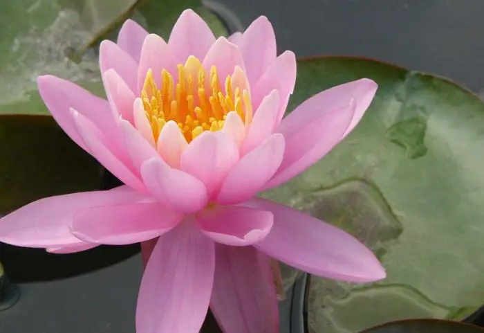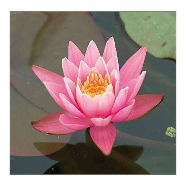 Kelchförmige, tiefrosa Blüten mit auffälligen orange-gelben Staubblättern, die zwischen den großen Blättern im Wasser im Herzen treiben.