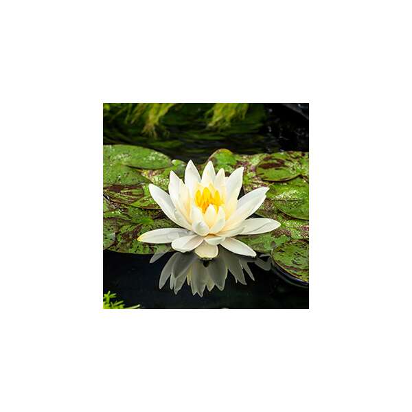 Blüht mit zitronengelben Doppelblüten und einem leuchtend gelben Zentrum. Die Blüten ragen bis zu 10 cm über der Wasseroberfläche hervor.