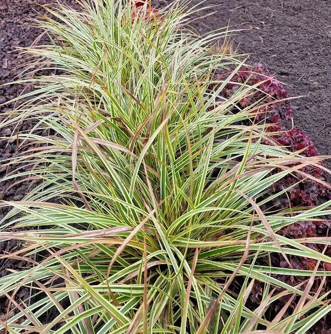 Carex morrowii 'Everglow' ist ein Ziergras mit aufrechten, überhängenden linearen grünen Blättern und einem cremeweißen Rand, die im Herbst orange werden.