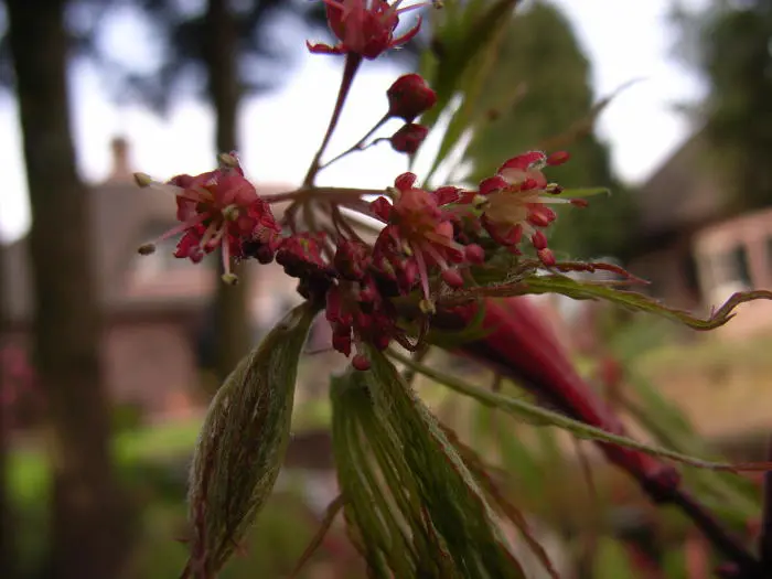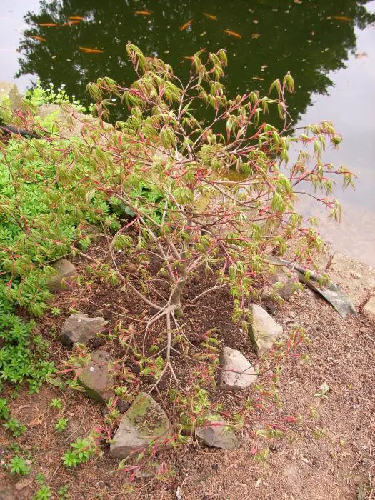 Acer palmatum 'Alloys' besitzt eine weit ausbreitende, pilzförmige Form mit sehr tief eingeritzten bronzegrünen Blättern. Im Sommer färben sich die Blätter im Herbst tiefgrün zu orange.