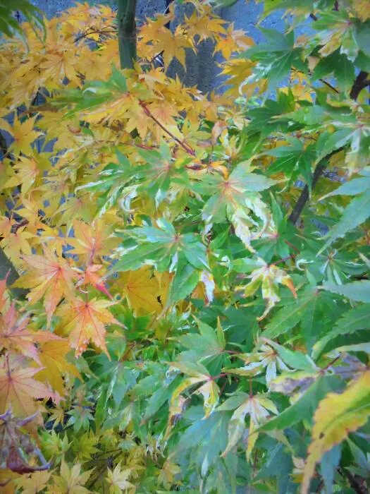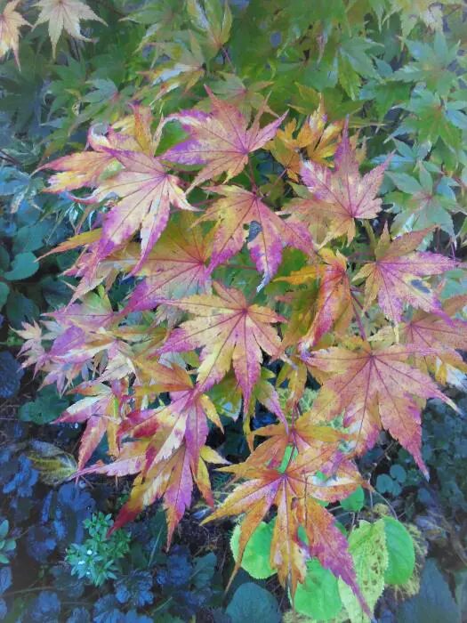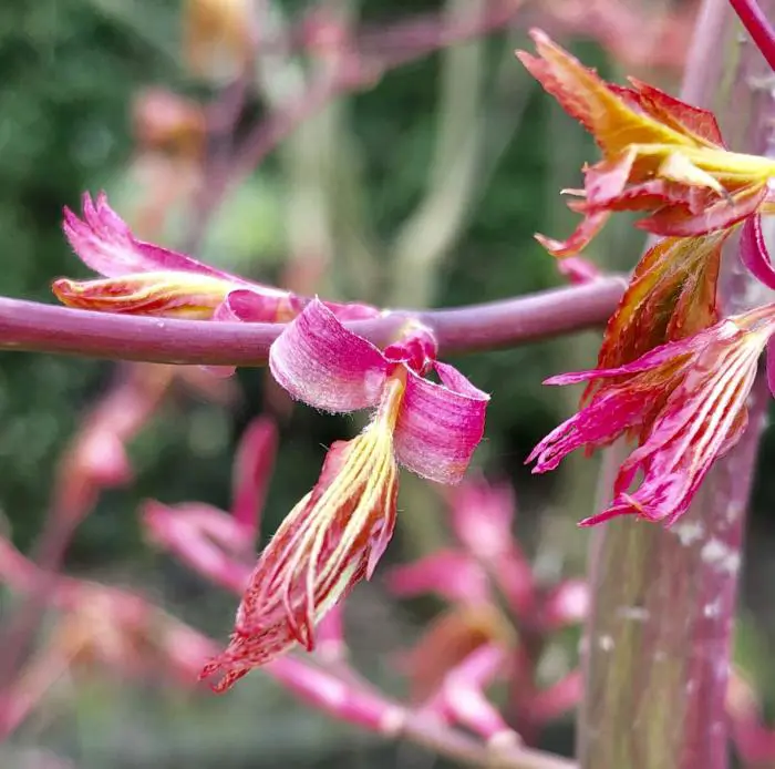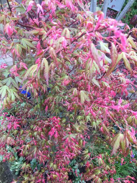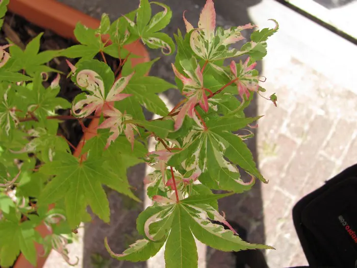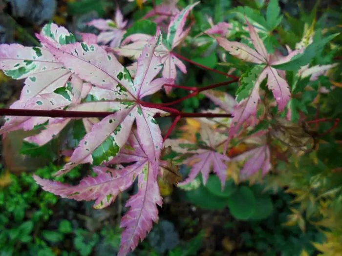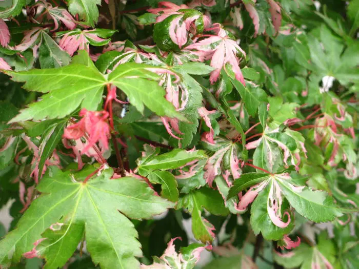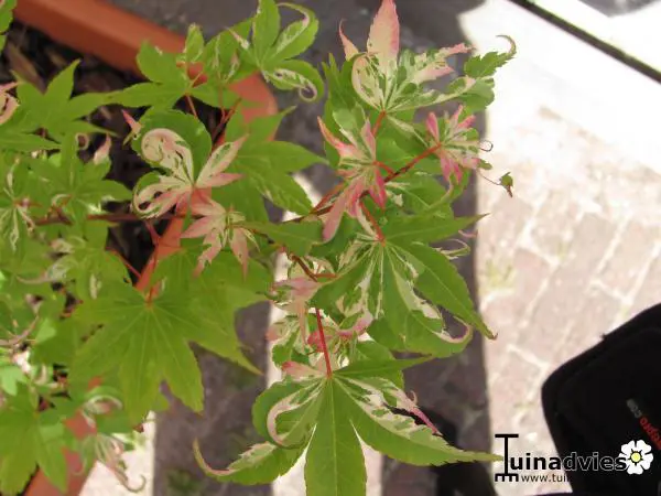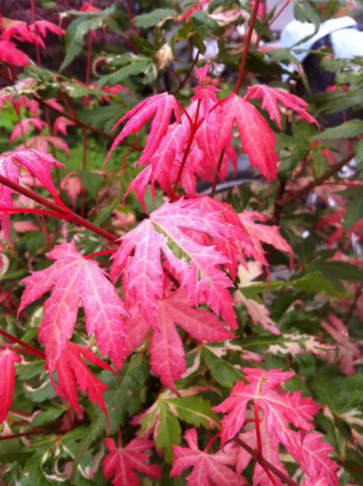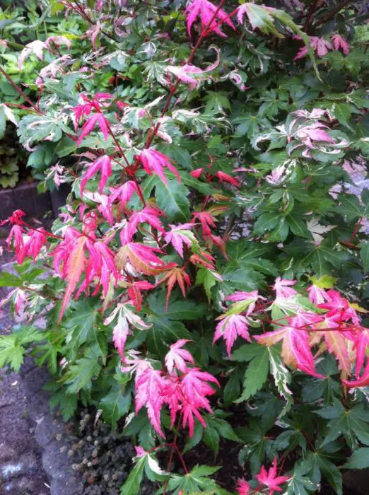 Der Japanische Ahorn ist ein langsam wachsender Strauch/Baum mit roten Winterästen und palmenförmig, weiß gefleckten Blättern. Rosa Blätter im Frühling, rosa/grün im Sommer und karminrot/gold im Herbst.