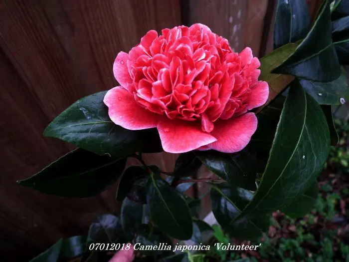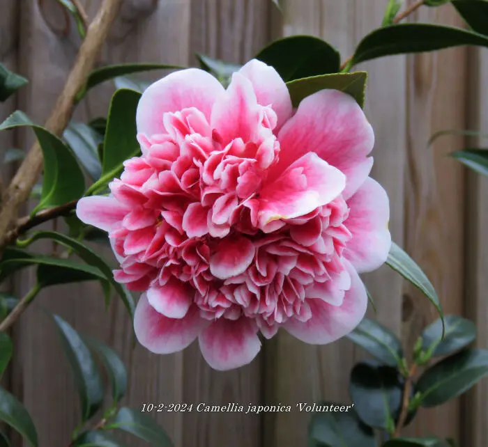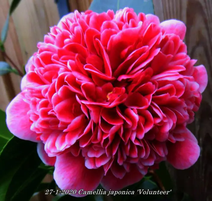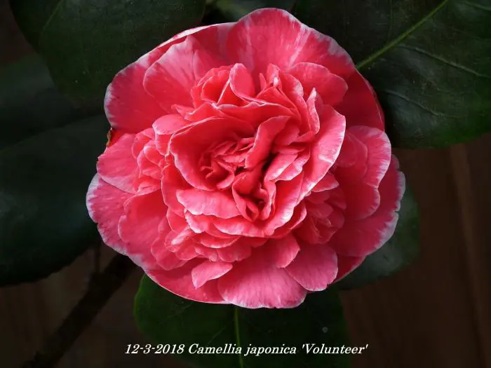 Camellia japonica 'Volunteer' blüht mit doppelten rötlich-rosa Blüten mit weißen Rändern.