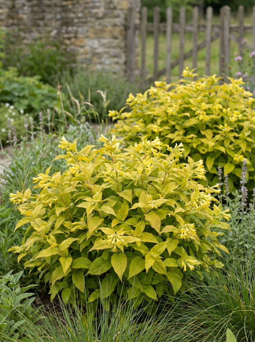 Diervilla rivularis 'Honeybee' stammt aus Nordamerika und wird für seine außergewöhnlich leuchtend goldgrünen/gelben Blätter geschätzt, die im Schatten grüner werden.