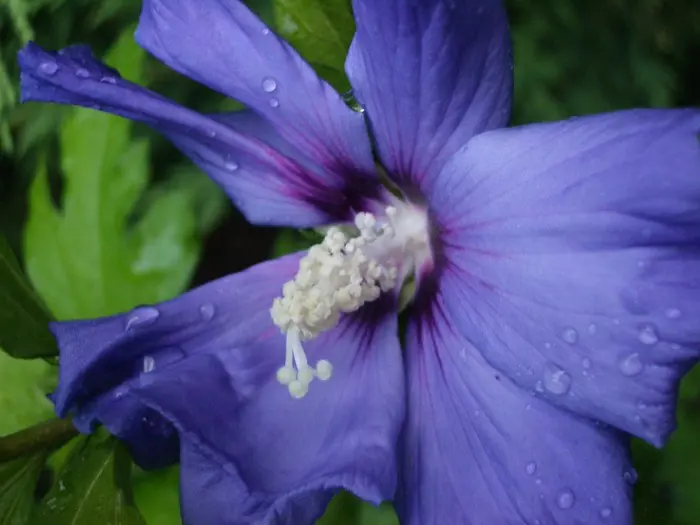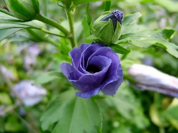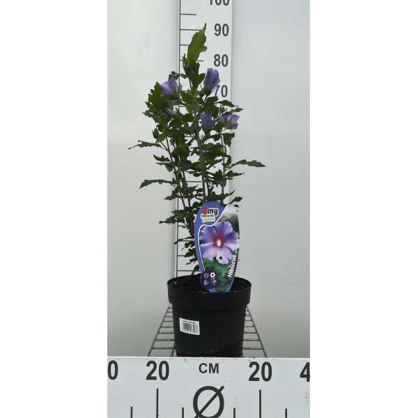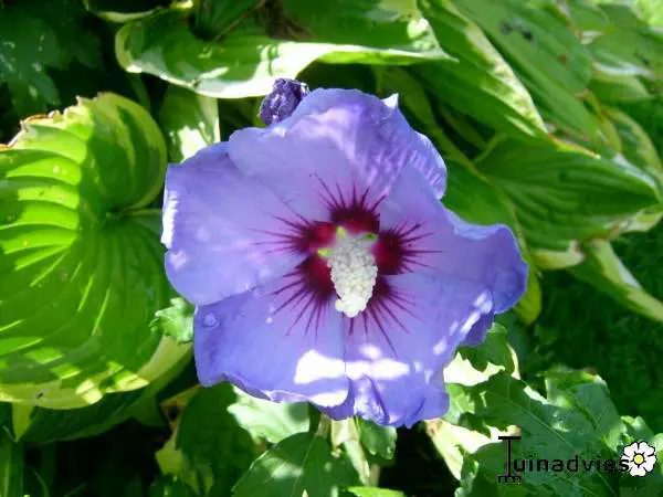Hibiscus syriacus 'Oiseau Bleu' ist ein üppig blühender Strauch mit leuchtend blauen Blüten, einem roten Herzen und leuchtend grünen Blättern.
