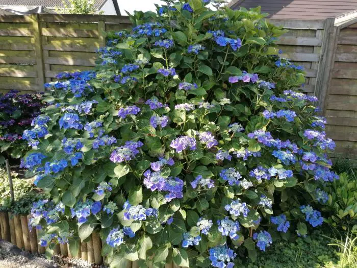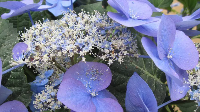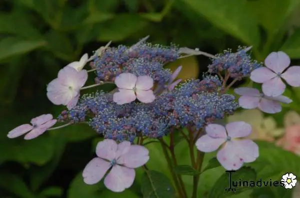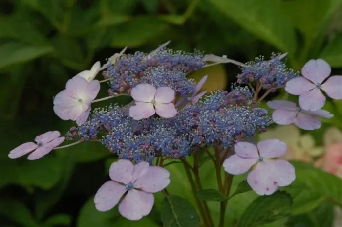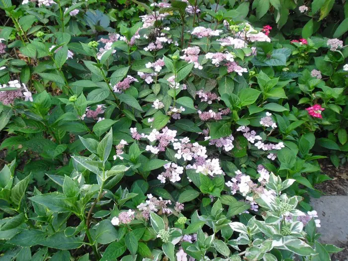 Sehr ähnlich wie die Lacecaps der Hortensia macrophilla (Teller), aber es gibt Unterschiede wie das Blatt der Serrata, das je nach Sonne rot wird und das Blatt spitzer ist.