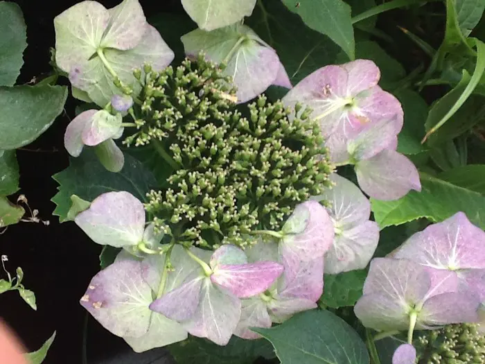 Eine Hortensie mit flachen, umbelförmigen Blüten.
