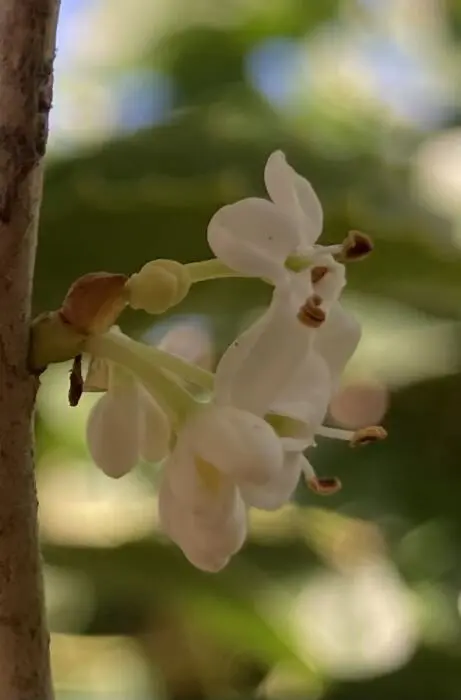 Die weißen Blüten haben einen starken Duft. Nach der Blüte erscheinen blau-schwarze Steinfrüchte.