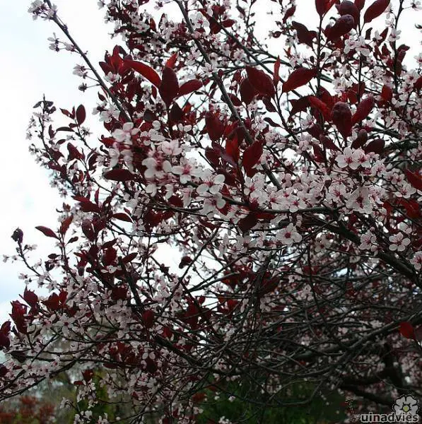 Zierpflaume mit weiß-rosa Blüten im April und Mai und lila-roten Blättern.