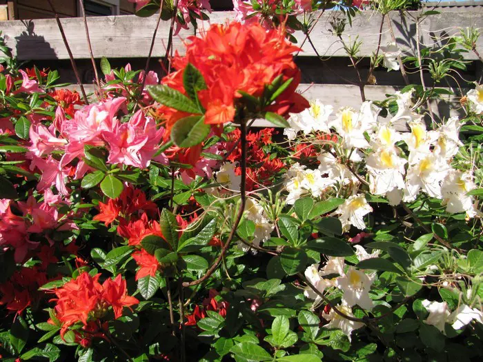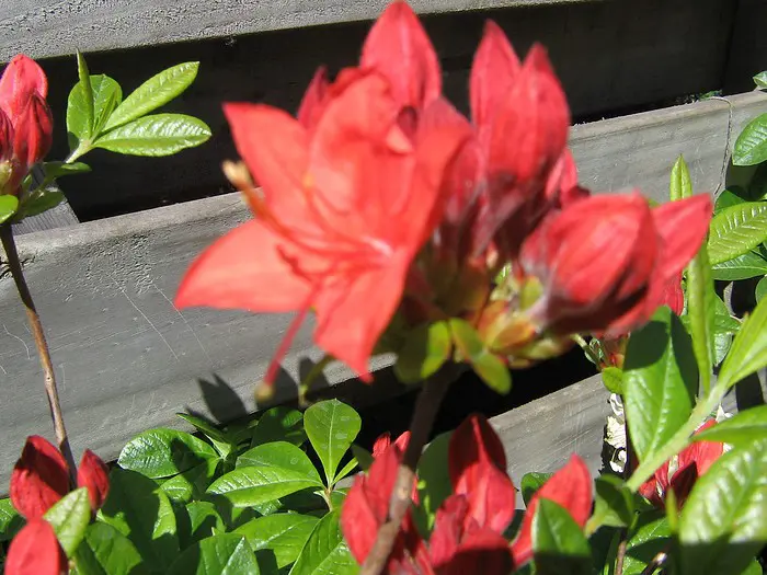 Rhododendron 'Carat', ein Azalea-viscosum-Hybrid, blüht leuchtend orange-rot.