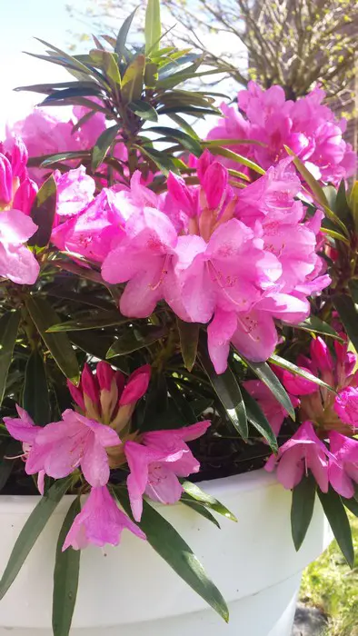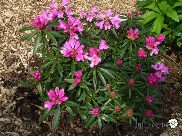 Ein kräftiges flieder-rosa Rhododendron mit sehr schönen, schmalen, lanzettförmigen Blättern.