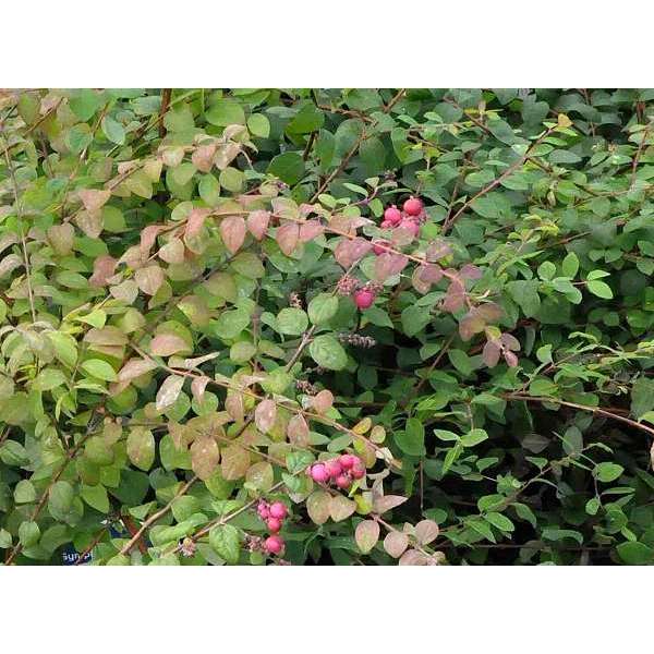 Symphoricarpos x chenaultii ist ein 100 cm hoher Strauch mit relativ kleinen ovalen Blättern.