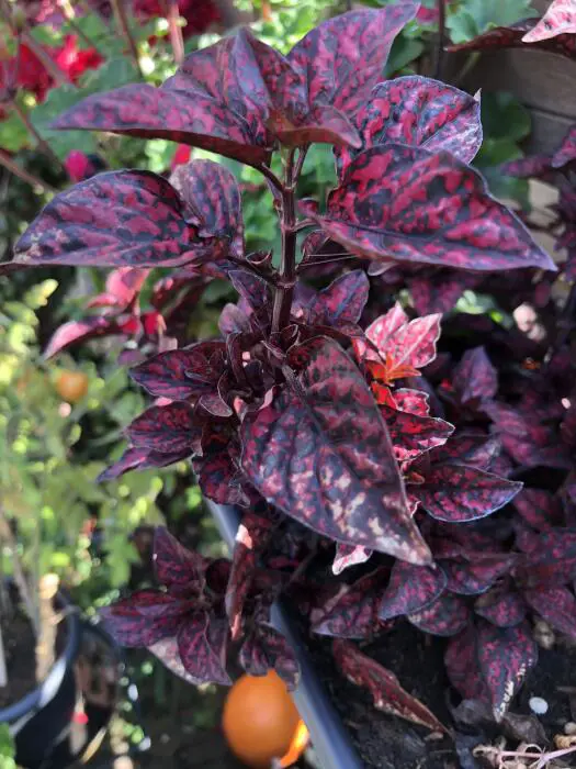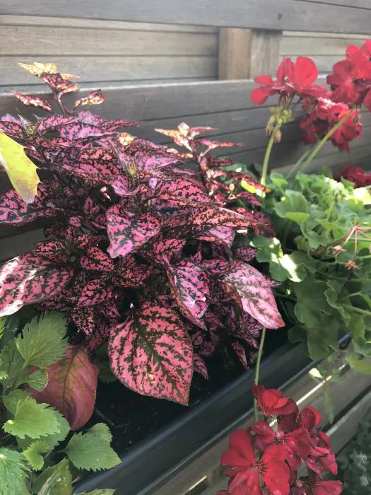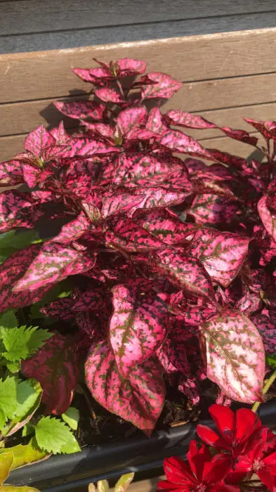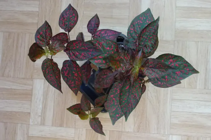 Hypoestes phyllostachya gilt hier als Zimmerpflanze, kann aber im Sommer bei 10–15 °C an einem geschützten Ort draußen platziert werden.