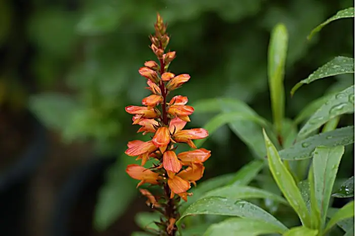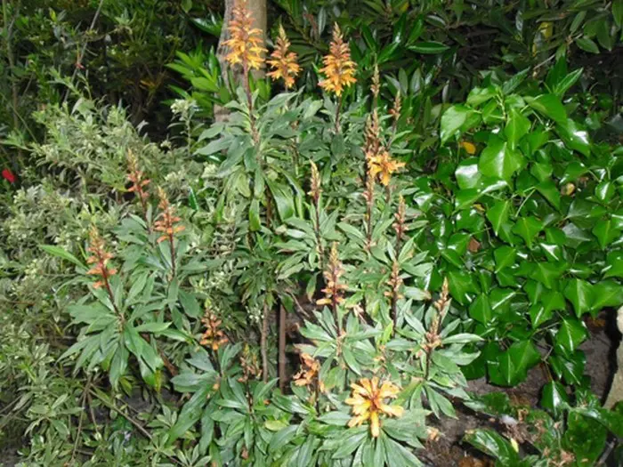 Sie blühen mit langen, federförmigen Spitzen mit röhrenförmigen Glocken.