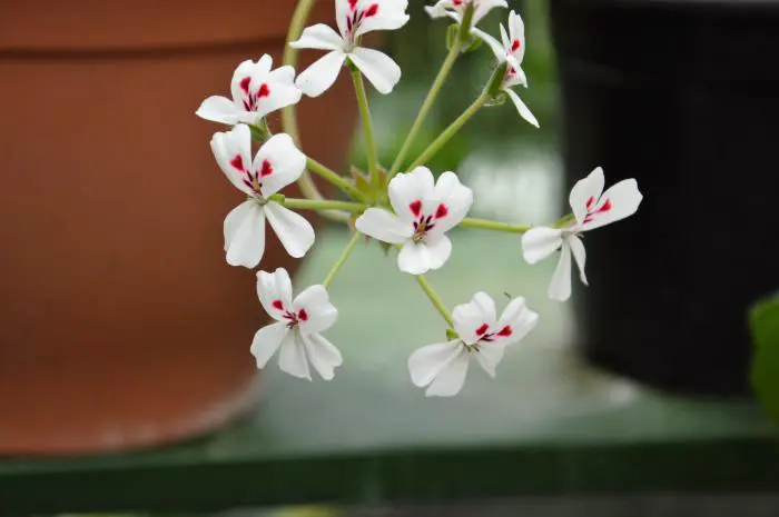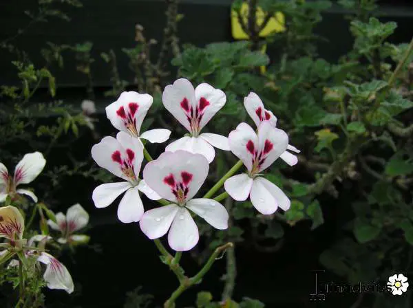 Pelargonium echinatum gehört zum Abschnitt Cortusina. Eine Pflanze mit sukkulenten, stacheligen Stängeln. Die Stacheln bestehen aus übrig gebliebenen, verhärteten Blättchen. Die verspielten Stängel verleihen der Pflanze ein bizarres Aussehen. Die weißen Blüten an langen Stängeln haben einen roten Fleck in Herzform in den beiden oberen Blütenblättern.
