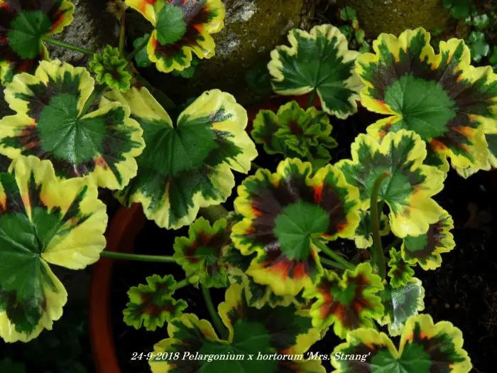 Pelargonium x hortorum 'Mrs. Strang' hat auffällig bunte Blätter, blau-grün, rötlich-braun und strohgelb.