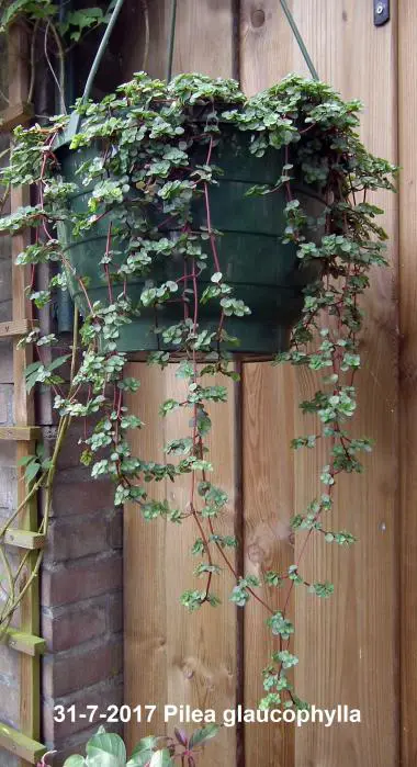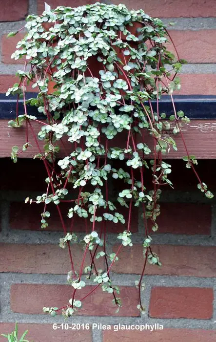 Pilea glaucophylla ist eine tropische Pflanze mit sehr attraktiven, kleinen silbergrünen Blättern an fleischigen roten Stängeln.