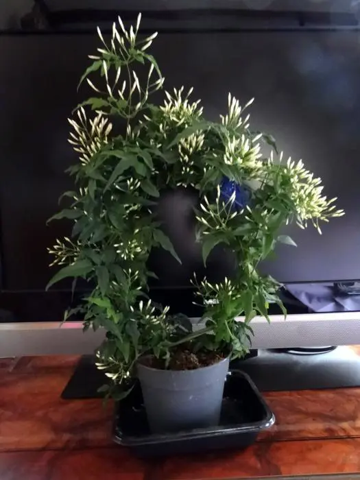 Ein reich blühender und immergrüner Kletterstrauch mit dunkelgrünen, glänzenden Blättern und weiß duftenden Dolden.