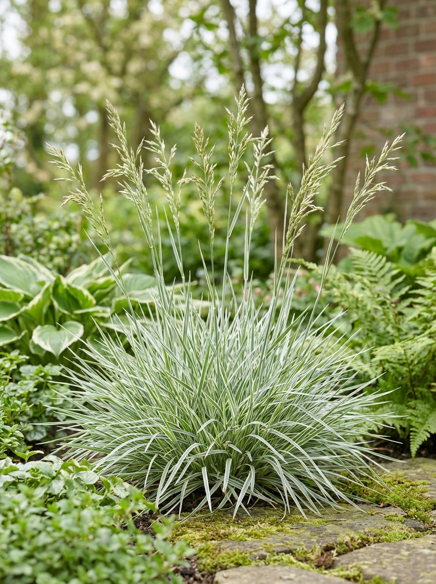 Ziergras mit gelb-weiß gestreiften silbergrauen Blättern.Für einen trockenen, sonnigen Ort