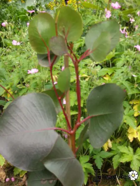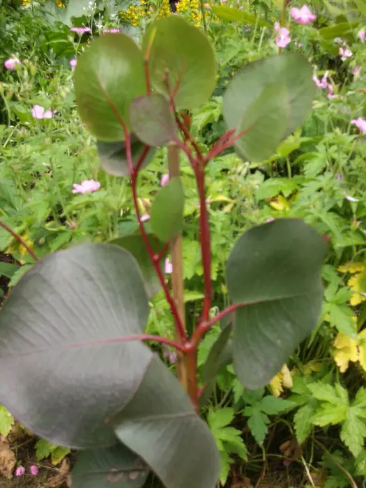 Eucalyptus caesia 'Silver Princess' hat einen dunkelbraunen Stamm, der sich in großen Blättern und hängenden Ästen ablöst.