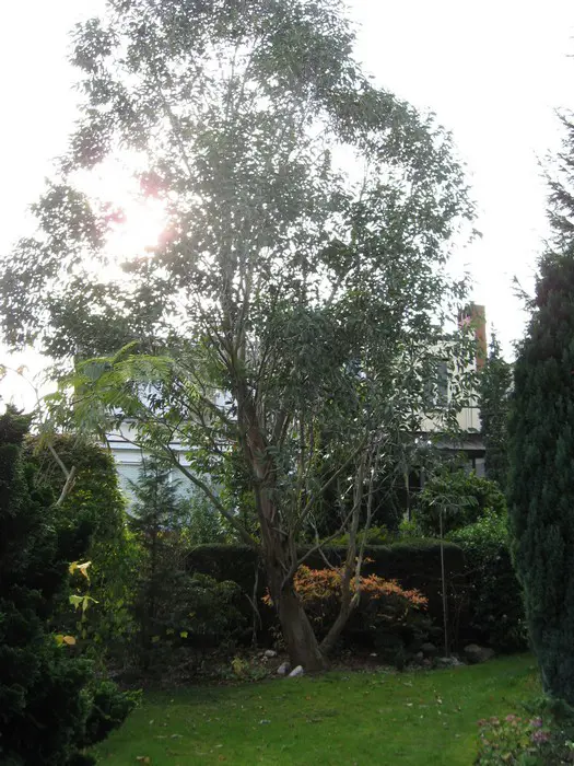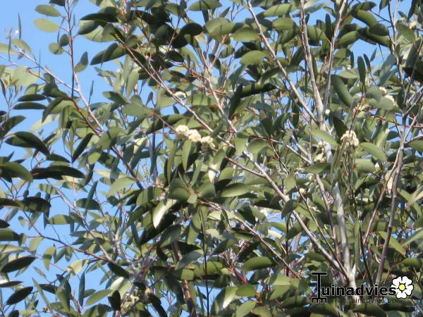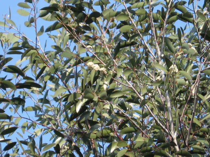 Wächst langsam und bildet einen strauchigen Baum mit aromatischen, grau-grünen, lederartigen Blättern an roten Stängeln. Ebenfalls sehr schön ist die silberne Rinde, die mit dem Alter abblättert.